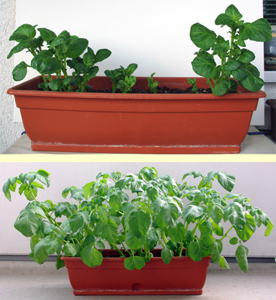 eingetragen am 04.07.2010 "Die dümmsten Bauern ..." Ursprünglich wollten wir nur einen ungenutzten Blumenkasten begrünen. Also versenkten wir drei Saatkartoffeln der überaus leckeren (weil besonders mehlig kochenden) Sorte "Adretta" darin, ihres Zeichens Kartoffel des Jahres 2009. Schon bald zeigten sich erste zaghafte Pflänzchen; unser Ziel war somit erreicht. Mittlerweile haben sich diese allerdings zu einem beachtlichen "Busch" entwickelt, der Unmengen Wasser verschlingt und Hoffnung auf eine reiche Ernte nährt. Es heißt doch wohl nicht umsonst:"Die dümmsten Bauern haben die dicksten Kartoffeln." (Über unsere Ernteerträge informieren wir ausführlich zu gegebener Zeit!)