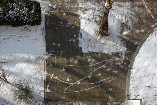 Schneespuren auf dem Gehwegpflaster